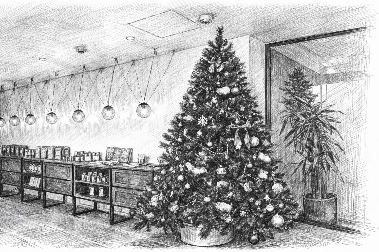 絶大な解放感を携えるロビーと比較すると小さく見えてしまうクリスマスツリーが空間を華やかにしている(今日はクリスマス)